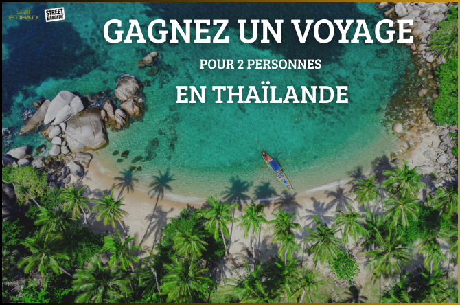 CFA Voyage, Street Bangkok et Seth Gueko célèbrent la Thaïlande avec un jeu concours très appétissant. Gagner un voyage en Thaïlande pour 2 personnes devient possible et vous permettra de rejoindre cette contrée rêvée. Découvrez la bouillonnante Bangkok. Laissez-vous tenter par la légendaire street food locale. Partez admirer les temples d’Ayuttaya et de Sukhothai. Offrez-vous une pause avec les massages thaïlandais. Puis, plongez au large des îles paradisiaques que compte le pays. Laissez-vous émouvoir dans les sanctuaires d’éléphant. Et assister à un match de boxe thai ! La destination Thaïlande coche beaucoup de critère pour un séjour réussi ! Alors n’attendez-plus et tenter votre chance !